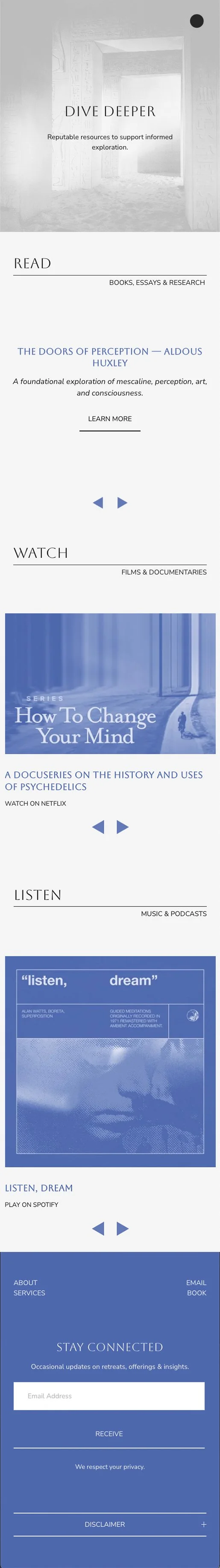 He works with people who have achieved success in demanding or public arenas yet sense that something essential has been left unattended—supporting them through mentorship, plant medicine, Human Design, and embodied daily practices to cultivate a durable relationship with their own inner wisdom.